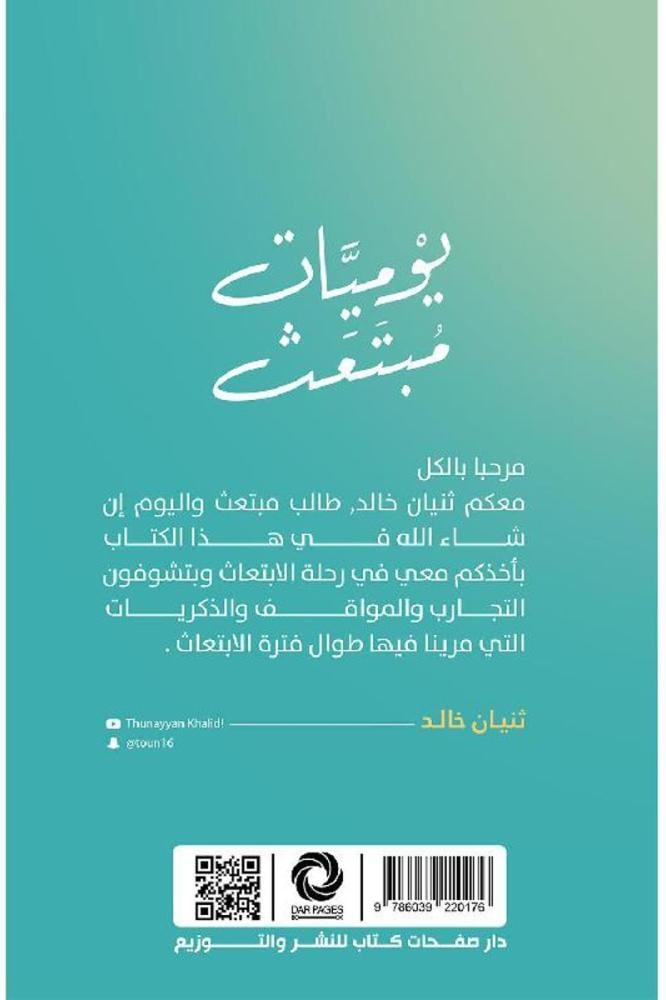 يوميات مبتعث بقلم ثنيان خالد ... مرحبًا بالكل... معكم ثنيان خالد، طالب مبتعث واليوم إن شاء الله في هذا الكتاب بأحذكم معي في رحلة الابتعاث وبتشوفون التجارب والمواقف والذكريات التي مرينا فيها طوال فترة الابتعاث.
